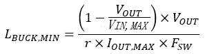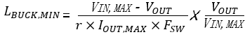 Where VIN,MAX is the maximum input voltage that the BUCK circuit needs to support, VOUT is the typical output voltage, FSW is the switching frequency, IOUT,MAX is the maximum load current that needs to be supported, and r is the ripple current coefficient, which is typically set to 0.3~0.5.