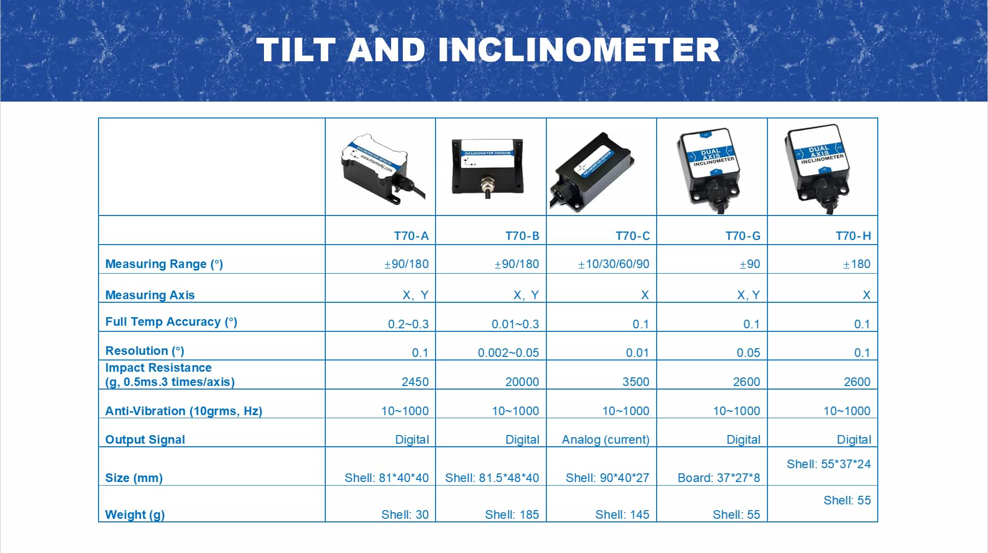 مستشعر الميل الرقمي ثنائي المحور T70-H لمراقبة الزاوية في الوقت الحقيقي لآلات البناء والرافعات الشوكية وأنظمة تتبع الطاقة الشمسية